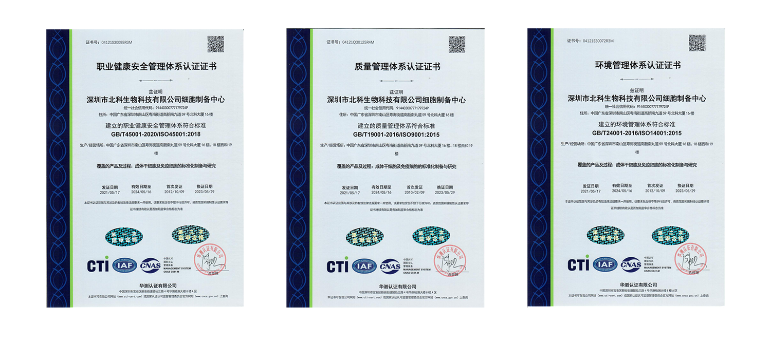 北科生物是国际较早在细胞生物医药范畴引入品质办理观点的企业,于2010年初次停止了ISO9001品质办理系统认证,并于2012年整合系统完成“品质、环境、职业安康宁静”三标一体认证。同时北科生物江苏分公司是中国大陆首家引入并经由过程“血液和生物医治生长协会”((Association for the Advancement of Blood & Biotherapies,简称AABB,原美国血库协会)认证的综合性细胞库。2017年5月,北科生物深圳细胞库(深圳综合细胞库)的四项自体细胞(人脐带来历间充质干细胞、人脐血来历造血干细胞、人胎盘来历间充质干细胞、人外周血免疫细胞)贮存利用手艺品质办理系统同时经由过程AABB认证,标记着北科生物已建立起细胞制备、贮存及临床转化利用办事的整合型手艺办理形式。