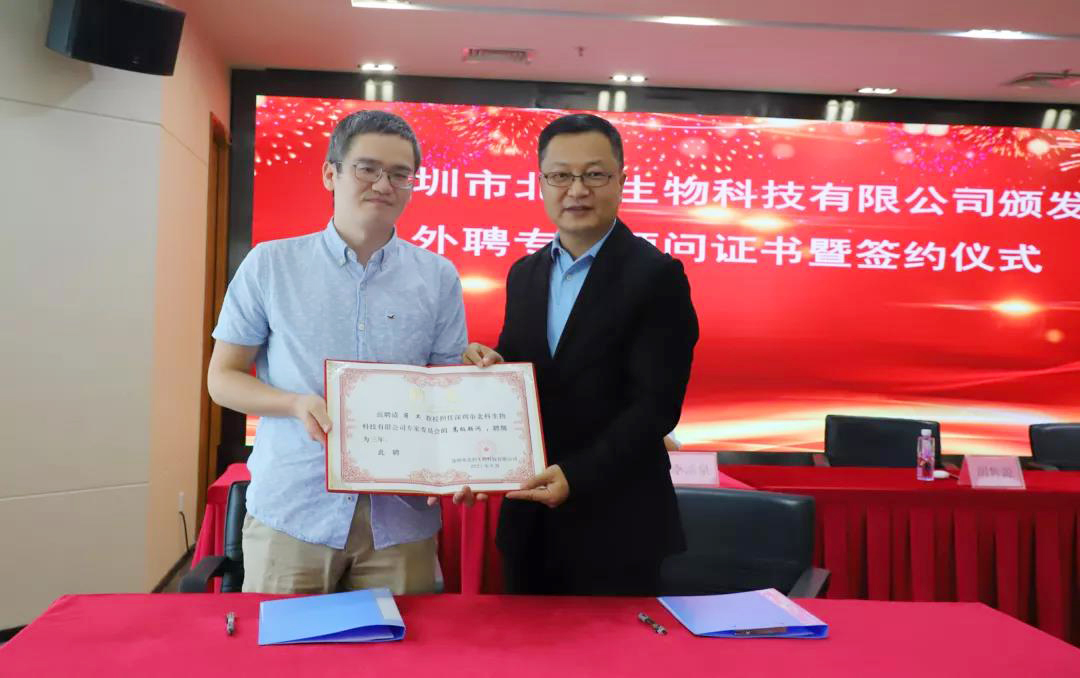 9月29日下战书,为鞭策公司完成高品质的成长,晋升公司的焦点协作力,深圳市北科生物科技无限公司进行了颁发外聘专家参谋证书暨协作名目签约典礼。北科生物董事长胡隽源博士与蒋卫传授签定《协作名目动向书》并颁发