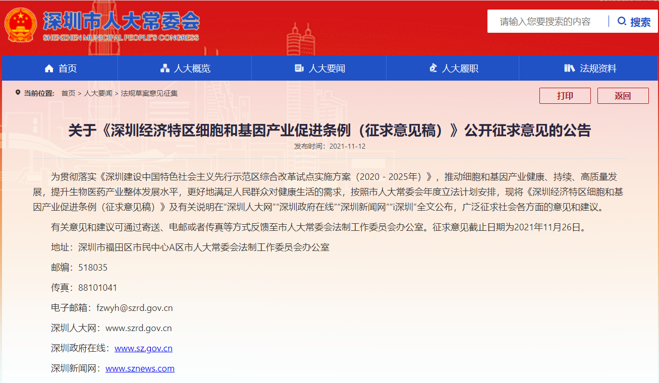 2021年11月12日,深圳新兴范畴主要立法《深圳经济特区细胞和基因财产增进条例(收罗定见稿)》在深圳市人大常委会网站上公然收罗定见。为贯彻落实《深圳扶植中国特点社会主义先行树模区综合鼎新试点实行计划