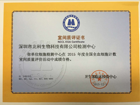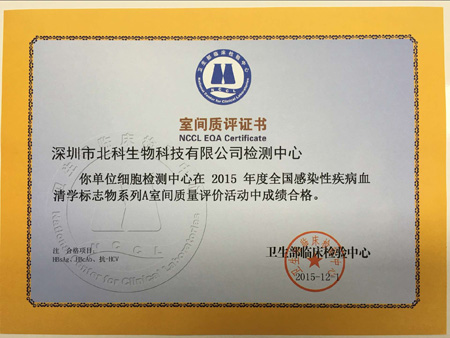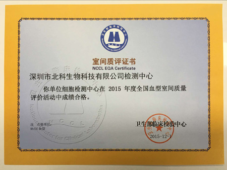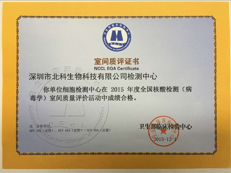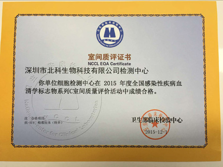 深圳细胞品质检测平台取得卫生部临床查验中间室间质评证书