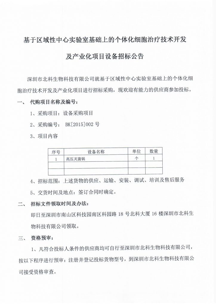 基于地区性中间尝试室根本上的个别化细胞医治手艺开辟及财产化名目装备投标通知布告