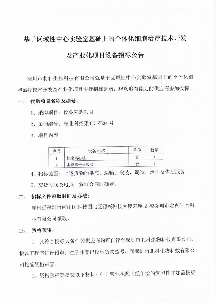 基于地区性中间尝试室根本上的个别化细胞医治手艺开辟及财产化名目装备投标通知布告