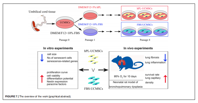 间充质干细胞医治肺支气管发育不良,用体外扩增取得充足的MSCs是知足临床医治的条件。在曩昔的医治BPD的临床前和临床研讨中,大大都是利用胎牛血清(FBS)作为人源MSCs培育增添物[2]。但这已不合适国度药品监视办理局药品审评中间(NMPA)对人源性干细胞产物的最新请求——“干细胞产物出产中应尽量防止利用植物源性资料”。同时,胎牛血清作为异源卵白,培育扩增人源MSCs会增添其免疫原性并增进细胞朽迈[3],是(shi)以,全(quan)天(t🐬ian)下范(fan)围内都在(zai)尽力寻觅(mi)胎牛血(xue)清(qing)的取代品。今朝,一种商(shang)品化的人血(xue)小板(ban)裂(lie)解液(hPL)作为(wei)间充(chong)质干细胞培(pei)育增添物取得了科研职员极(ji)大的存(cun)眷。